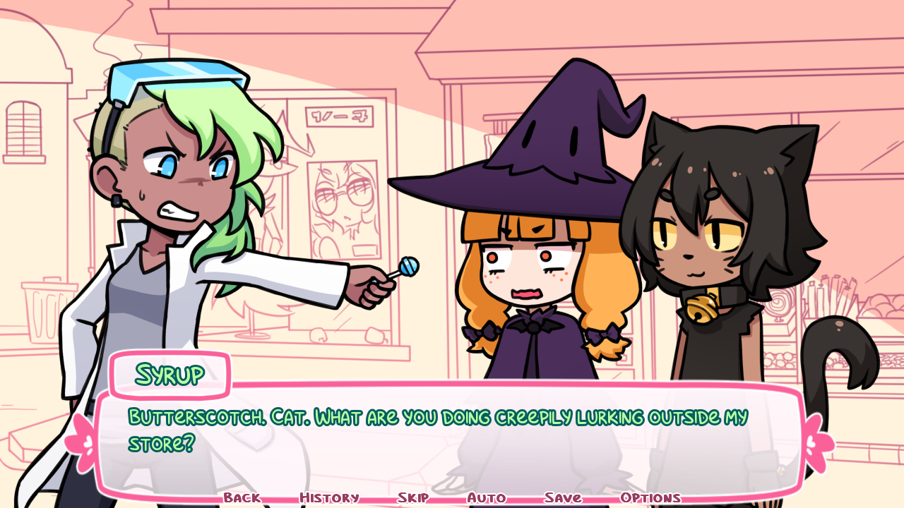 Content advisory: candy nudity. In some paths, she gets eaten. In some paths, characters die. There are a few quick screen shakes and flashes.